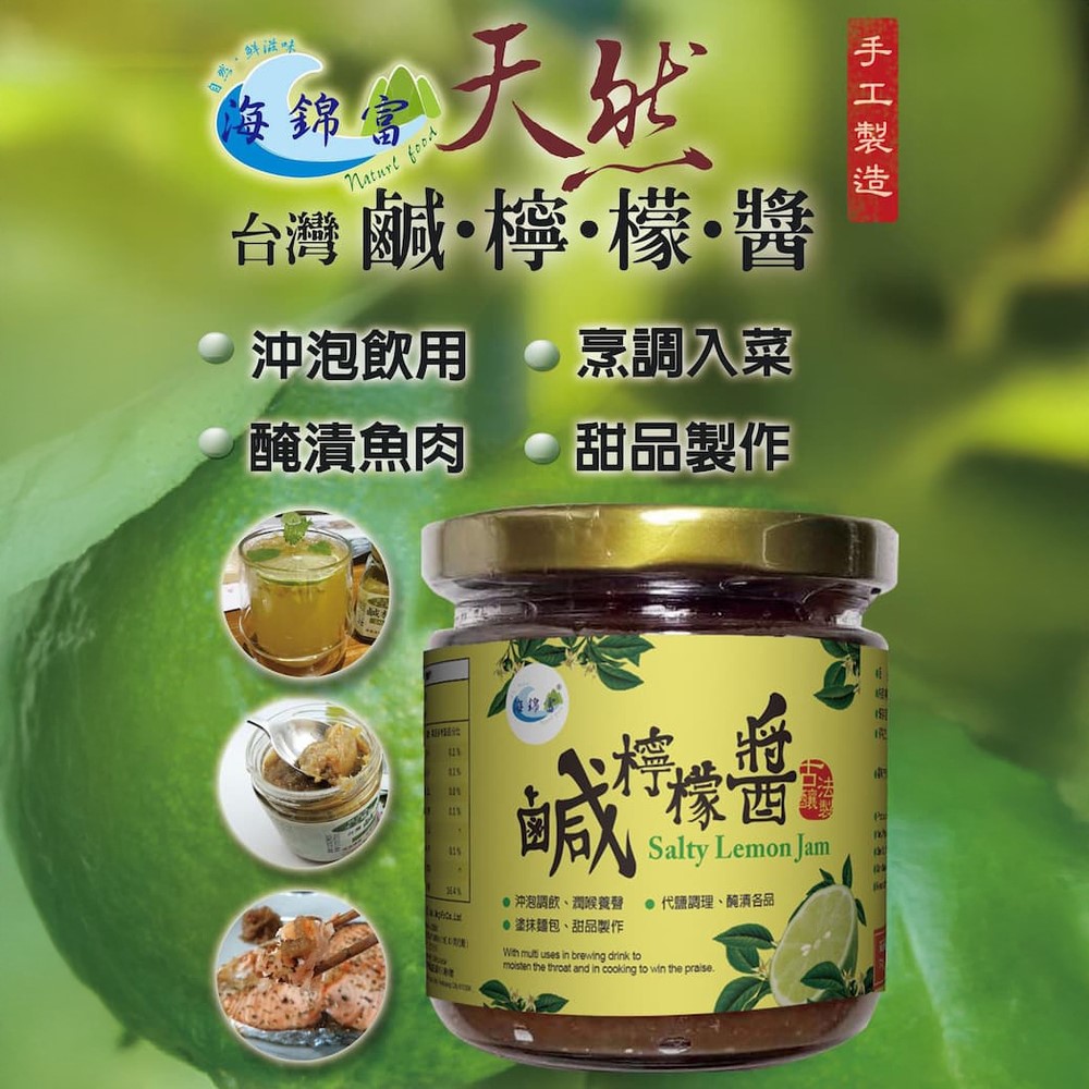 品名:鹹檸檬醬店家:海錦富有限公司原料:新鮮檸檬、鹽保存方式:未開封避免日光照射,常溫陰涼處存放,開封後乾淨勺適量取用,請冷藏保存