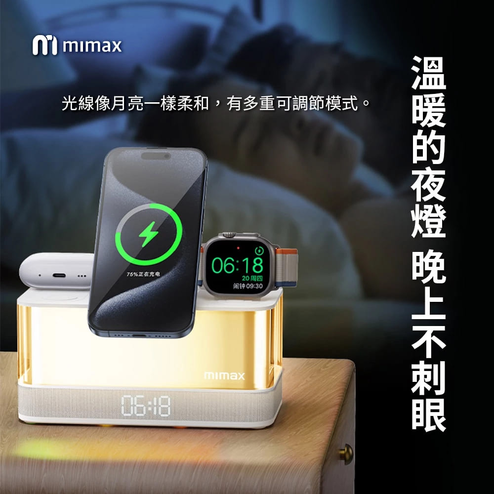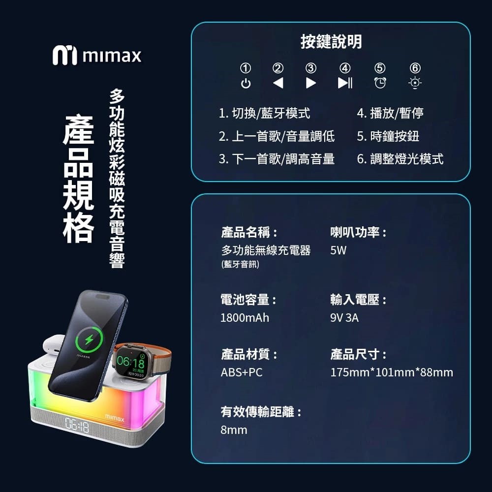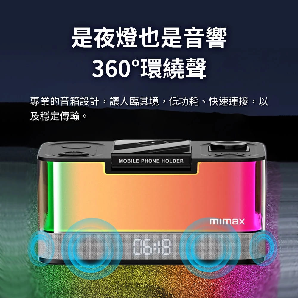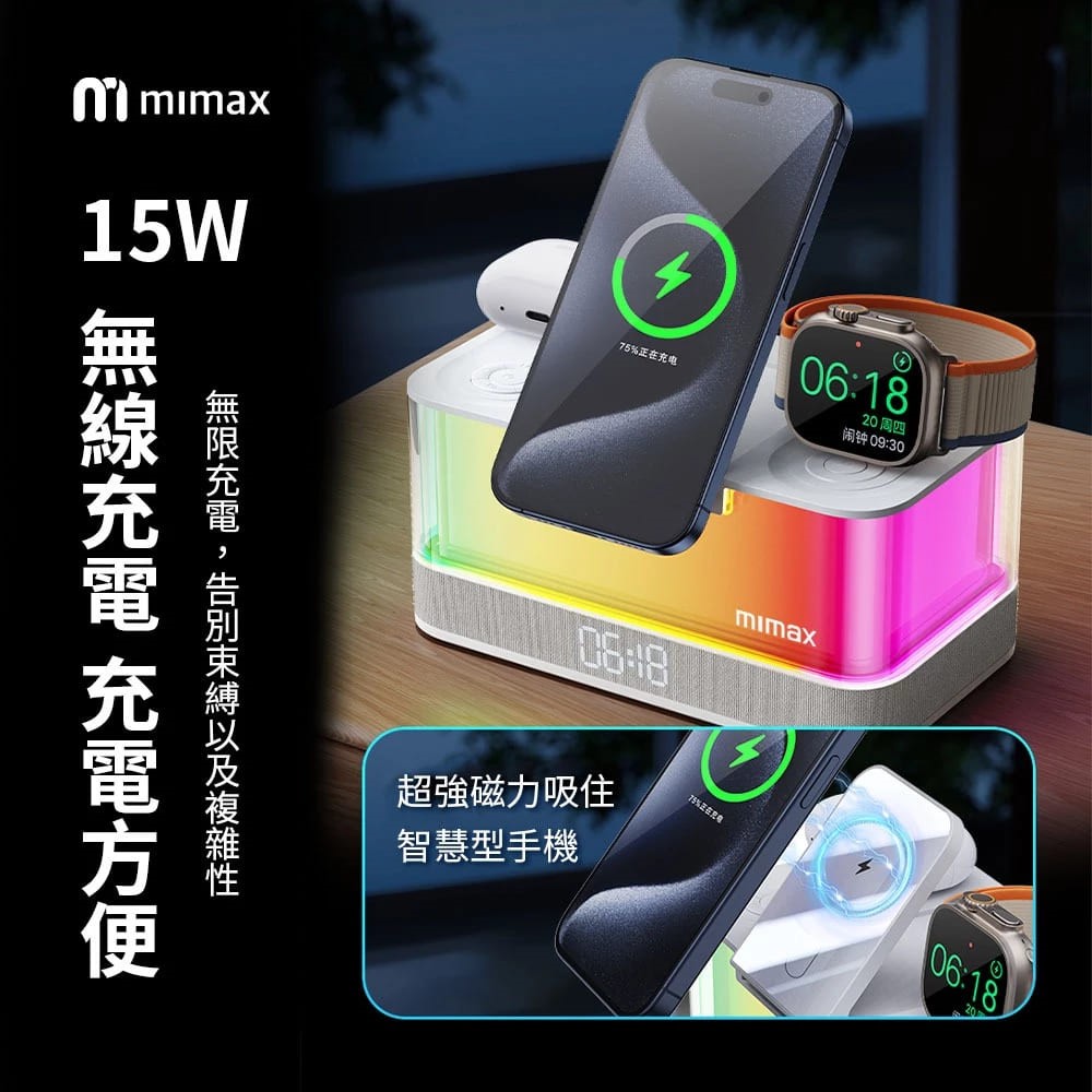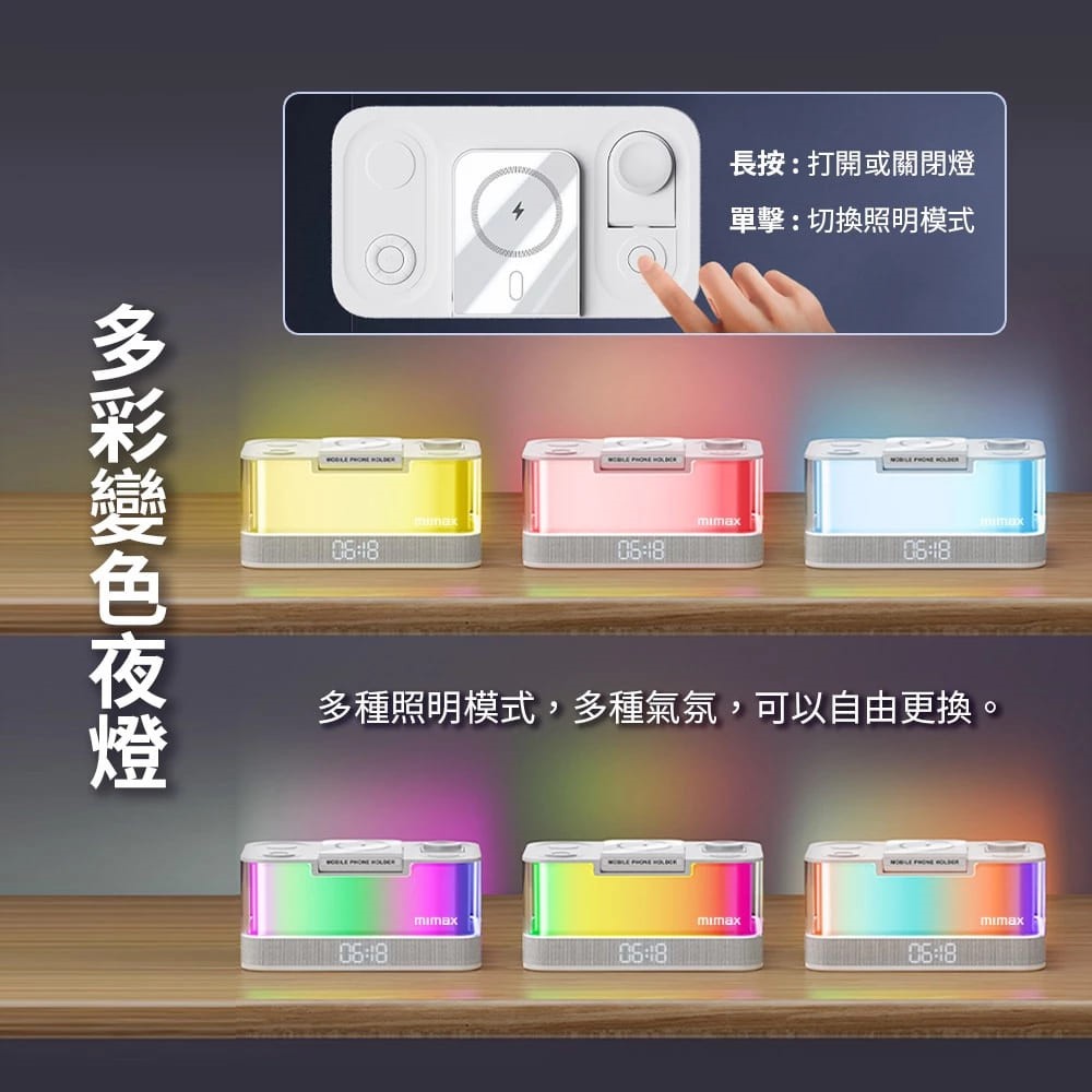 👍藍芽接收距離約十公尺👍多種變色照明模式,自由更換👍15W無線充電👍可無線充多種設備👍磁吸充電邊看劇👍支架可折疊 0-90度隨意調節👍360度環繞聲👍數位顯示時鐘螢幕👍織物音孔 極簡時尚※ 內置鋰電池 僅供藍牙音響使用(不能充手機 手錶 耳機)